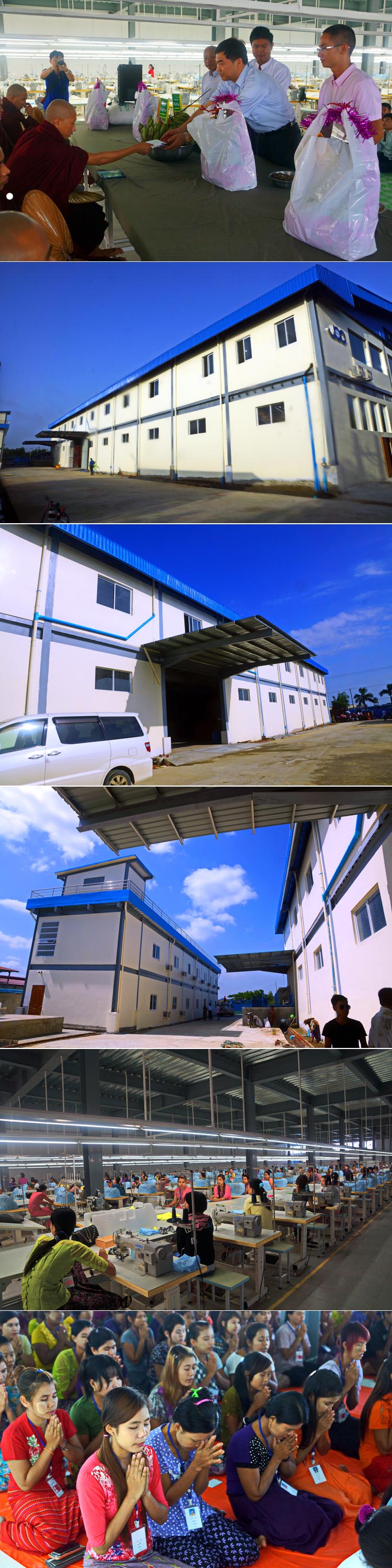 2015年7月1日,歷經(jīng)半年的緊張施工和設(shè)備安裝,國際公司緬甸服裝廠迎來試開業(yè)。國際公司總經(jīng)理吳應(yīng)宏及陶核、夏志平等一行三人專程趕赴緬甸,見證了這一值得紀念的時刻。緬甸是一個佛教國家,工廠開業(yè)通常要有一個佛教儀式,即由和尚誦經(jīng),教化員工要人心向善,服從管理,認真做人做事,并祈禱工廠一帆風(fēng)順。緬甸服裝廠一期工程計劃招錄400名員工,目前已全部到位,服裝加工已全面展開。相信經(jīng)過一段時間的磨合,緬甸服裝廠一定會頻傳佳音。