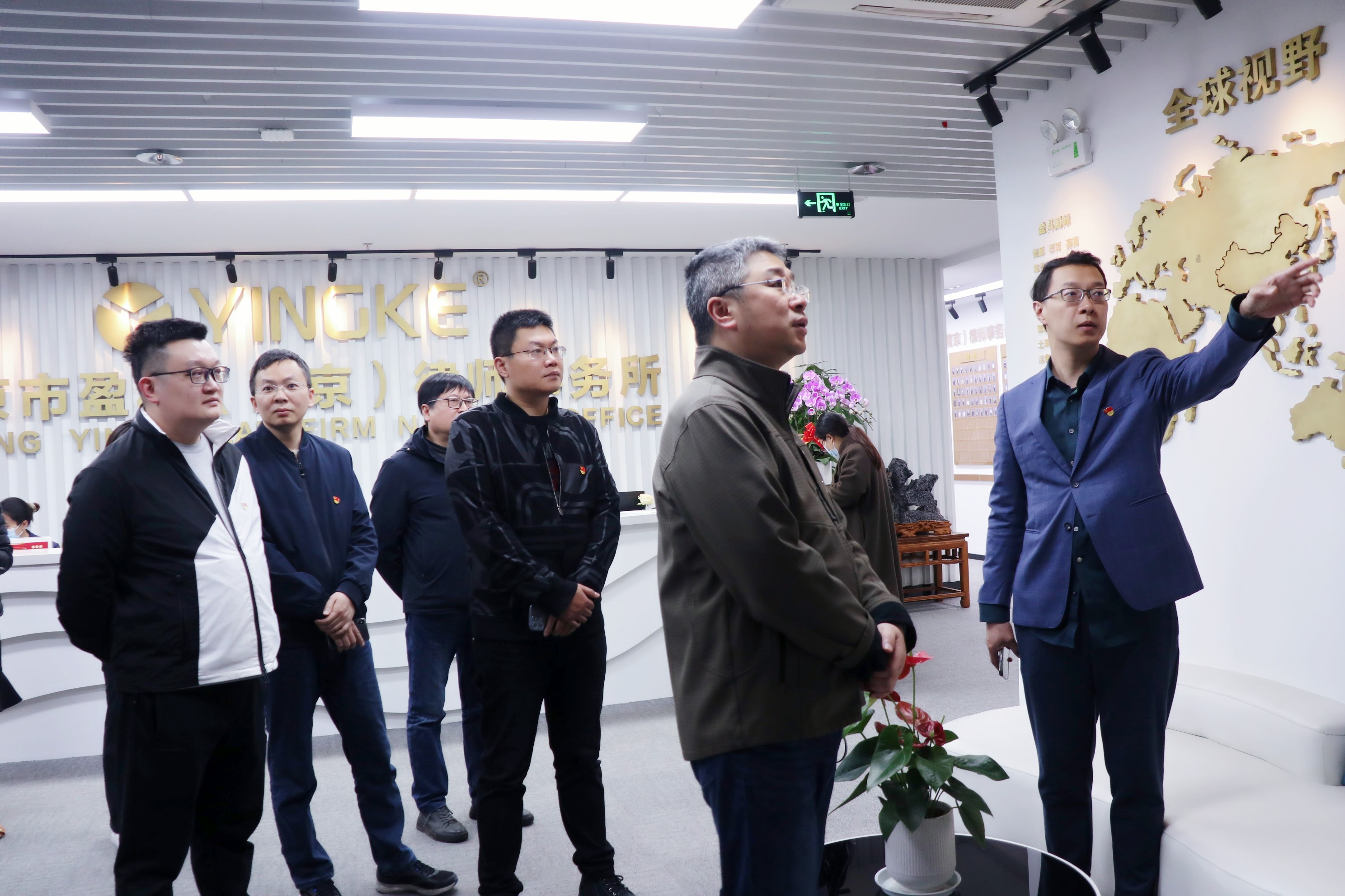 在盈科南京第一黨支部書記田鴻、副書記沈東鵬和組織委員周倩穎等黨員律師的陪同下,與會(huì)人員參觀了盈科著作陳列館、律所文化墻、黨建文化墻、紐約廳等場所,并進(jìn)行了座談交流。