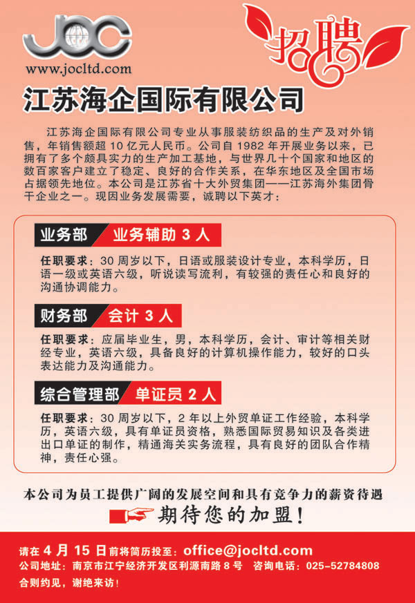 TEL:+86-025-52784808 FAX:+86-025-52784879 Email:webmaster@jocltd.com 中國·南京·江寧開發(fā)區(qū)利源南路8號